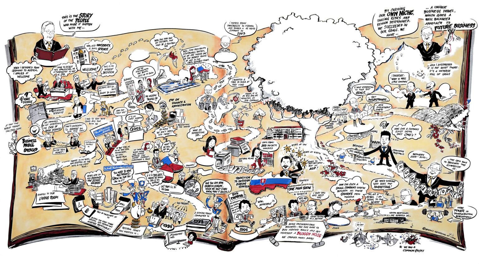 Anlässlich eines Firmenjubiläums wurden zahlreiche Eckdaten der Unternehmensgeschichte und Anekdoten als Graphic-Recording festgehalten. In einem weiteren Schritt wurde dieses in ein detailliertes Rich-picture weiterentwickelt.