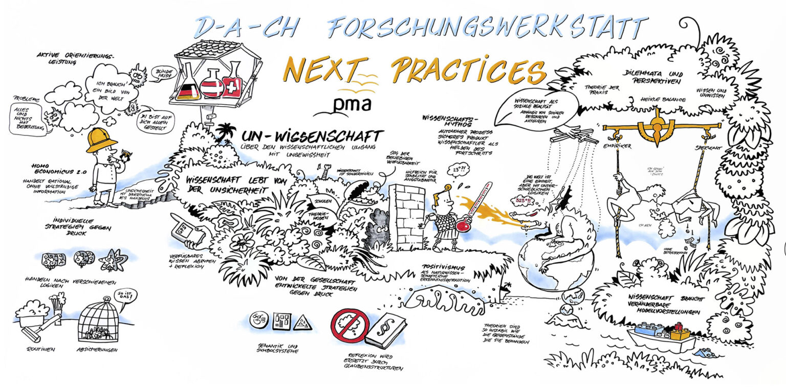 Das Graphic Recording hielt auf mehreren Postern die Ergebnisse der Dach Forschungswerkstatt und einiger Workshops fest.